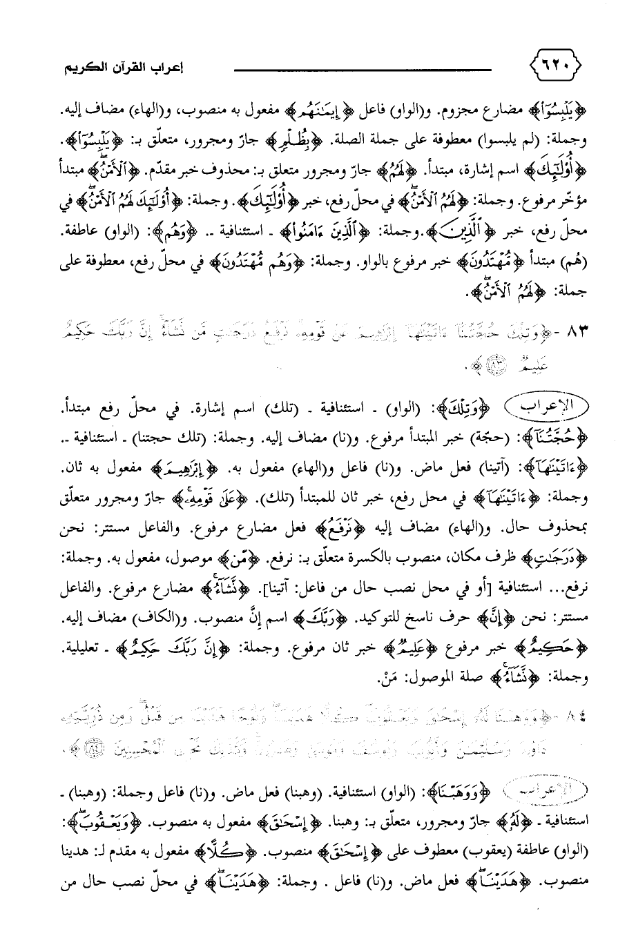 وجملة: {آتَيْناها} في محل رفع، خبر ثان للمبتدإ (تلك). {عَلى قَوْمِهِ} جارّ ومجرور متعلّق بمحذوف حال. و (الهاء) مضاف إليه {نَرْفَعُ} فعل مضارع مرفوع. والفاعل مستتر: نحن {دَرَجاتٍ} ظرف مكان، منصوب بالكسرة متعلّق ب: نرفع. {مَنْ} موصول، مفعول به. وجملة: