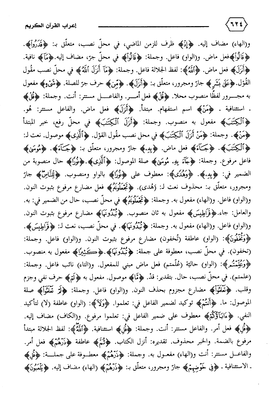 {الْكِتابَ}. {جاءَ} فعل ماض. {بِهِ} جارّ ومجرور، متعلّق ب: {جاءَ}. {مُوسى} فاعل مرفوع. وجملة: {جاءَ بِهِ مُوسى} صلة الموصول: {الَّذِي}. {نُوراً} حال منصوبة من الضمير في: {بِهِ}. {وَهُدىً}: معطوف على {نُوراً} بالواو ومنصوب. {لِلنّاسِ} جارّ ومجرور، متعلّق ب: محذوف نعت ل: (هدى). {تَجْعَلُونَهُ} فعل مضارع مرفوع بثبوت النون.