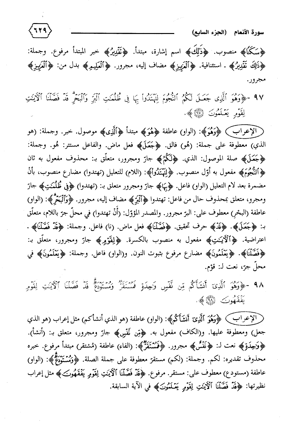 {جَعَلَ} صلة الموصول: الذي. {لَكُمُ} جارّ ومجرور، متعلّق ب: محذوف مفعول به ثان {النُّجُومَ} مفعول به أوّل منصوب. {لِتَهْتَدُوا}: (اللام) للتعليل (تهتدوا) مضارع منصوب، بأن مضمرة بعد لام التعليل (الواو) فاعل. {بِها} جارّ ومجرور متعلق ب: (تهتدوا) {فِي ظُلُماتِ} جارّ ومجرور، متعلق بمحذوف حال من فاعل: تهتدوا {الْبَرِّ} مضاف إليه، مجرور. {وَالْبَحْرِ}: (الواو) عاطفة (البحر) معطوف على: البرّ مجرور. والمصدر المؤوّل: (أن تهتدوا) في محلّ جرّ باللام، متعلّق ب: {جَعَلَ}. {قَدْ} حرف تحقيق. {فَصَّلْنَا} فعل ماض. (نا) فاعل. وجملة: {قَدْ فَصَّلْنَا} - اعتراضية. {الْآياتِ} مفعول به منصوب بالكسرة. {لِقَوْمٍ} جارّ ومجرور، متعلّق ب:
