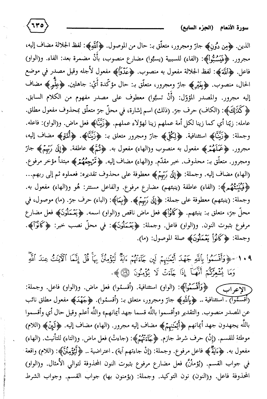 الذين. {مِنْ دُونِ} جارّ ومجرور، متعلّق ب: حال من الموصول. {اللهِ}: لفظ الجلالة مضاف إليه، مجرور. {فَيَسُبُّوا}: (الفاء) للسببية (يسبّوا) مضارع منصوب، بأن مضمرة بعد: الفاء. و (الواو) فاعل. {اللهِ}: لفظ الجلالة مفعول به منصوب. {عَدْواً} مفعول لأجله وقيل مصدر في موضع الحال، منصوب. {بِغَيْرِ} جارّ ومجرور، متعلّق ب: حال مؤكّدة أي: جاهلين. {عِلْمٍ} مضاف إليه مجرور. والمصدر المؤوّل: (أن تسبّوا) معطوف على مصدر مفهوم من الكلام السابق.