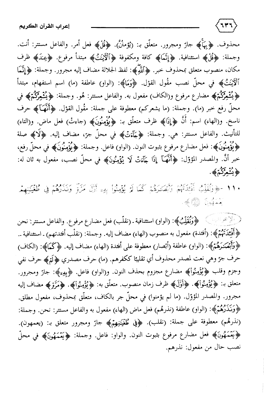 وجملة: {قُلْ} استئنافية. {إِنَّمَا} كافة ومكفوفة {الْآياتُ} مبتدأ مرفوع. {عِنْدَ} ظرف مكان، منصوب متعلق بمحذوف خبر. {اللهِ}: لفظ الجلالة مضاف إليه مجرور. وجملة: {إِنَّمَا الْآياتُ} في محلّ نصب مقول القول. {وَما}: (الواو) عاطفة (ما) اسم استفهام، مبتدأ {يُشْعِرُكُمْ} مضارع مرفوع و (الكاف) مفعول به. والفاعل مستتر: هو. وجملة: {يُشْعِرُكُمْ} في محلّ رفع خبر (ما).وجملة: (ما يشعركم) معطوفة على جملة: مقول القول. {أَنَّها} حرف ناسخ. و (الهاء) اسم: أنّ {إِذا} ظرف متعلّق ب: {يُؤْمِنُونَ} (جاءت) فعل ماض. و (التاء) للتأنيث. والفاعل مستتر: هي. وجملة: {جاءَتْ} في محلّ جرّ، مضاف إليه. {لا} صلة {يُؤْمِنُونَ}: فعل مضارع مرفوع بثبوت النون. (الواو) فاعل. وجملة: {يُؤْمِنُونَ} في محلّ رفع، خبر أنّ. والمصدر المؤوّل: {أَنَّها إِذا جاءَتْ لا يُؤْمِنُونَ} في محلّ نصب، مفعول به ثان له: