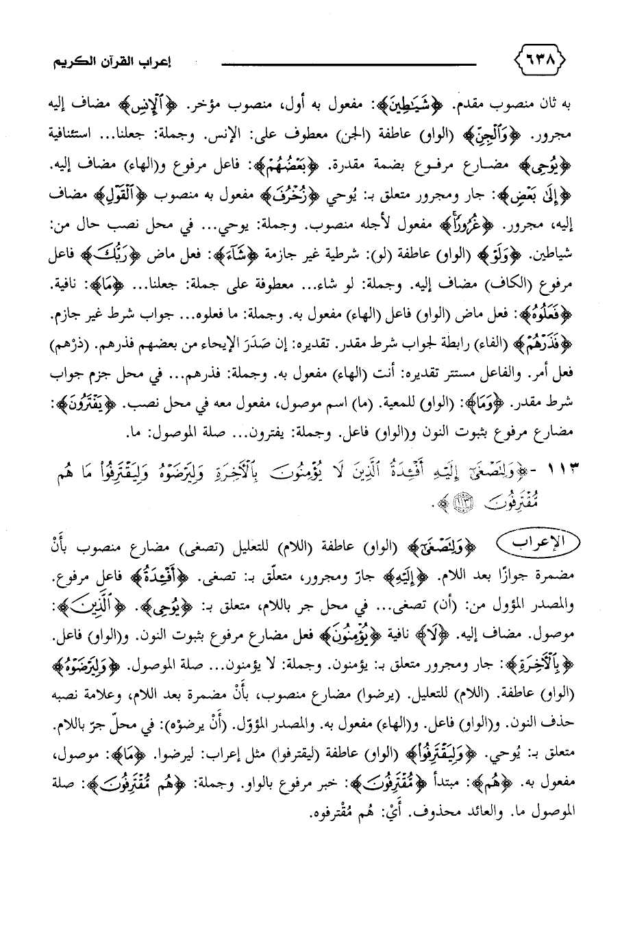 به ثان منصوب مقدم. {شَياطِينَ}: مفعول به أول، منصوب مؤخر. {الْإِنْسِ} مضاف إليه مجرور. {وَالْجِنِّ} (الواو) عاطفة (الجن) معطوف على: الإنس. وجملة: جعلنا ... استئنافية {يُوحِي} مضارع مرفوع بضمة مقدرة. {بَعْضُهُمْ}: فاعل مرفوع و (الهاء) مضاف إليه.