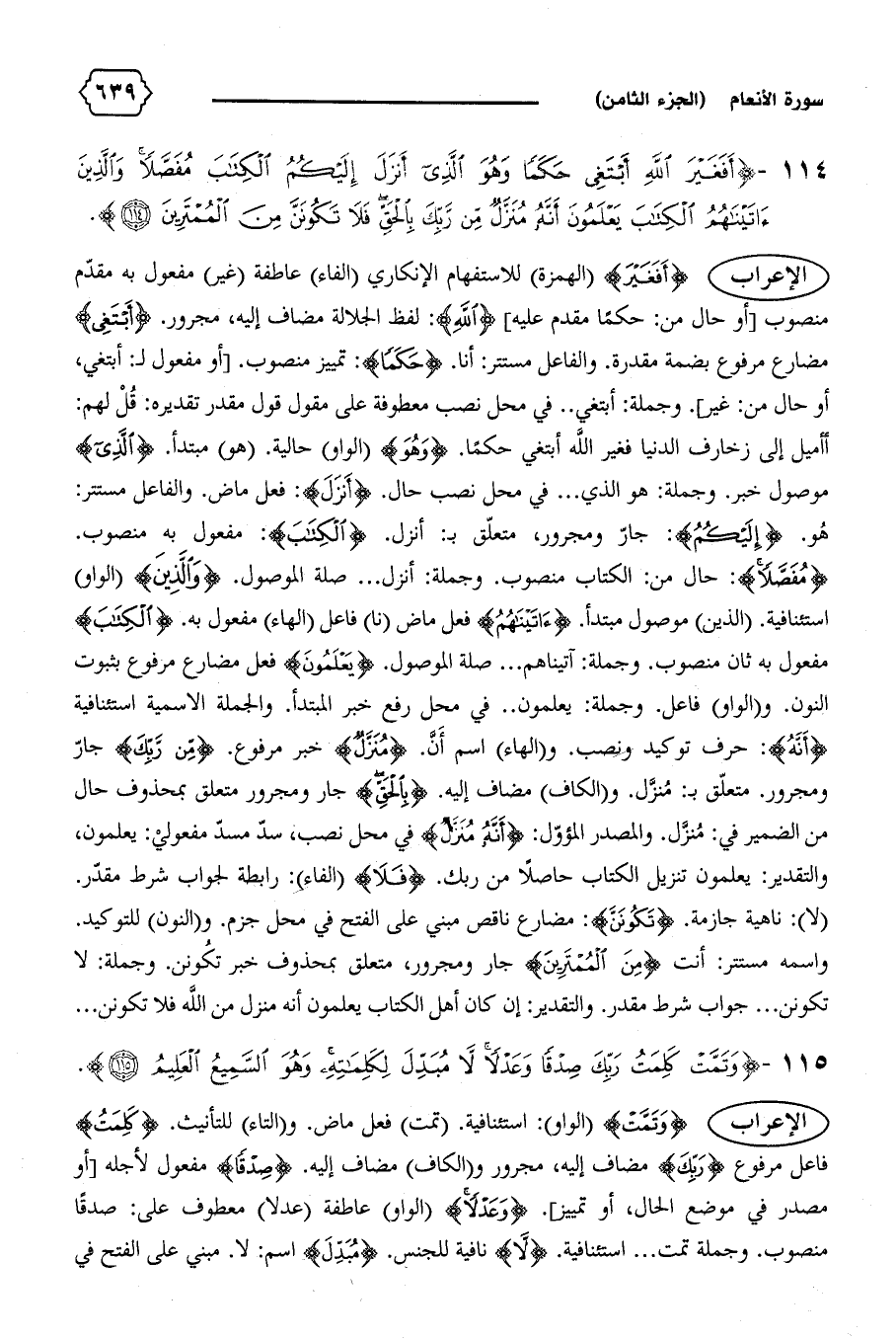 ١١٤ - {أَفَغَيْرَ اللهِ أَبْتَغِي حَكَماً وَهُوَ الَّذِي أَنْزَلَ إِلَيْكُمُ الْكِتابَ مُفَصَّلاً وَالَّذِينَ آتَيْناهُمُ الْكِتابَ يَعْلَمُونَ أَنَّهُ مُنَزَّلٌ مِنْ رَبِّكَ بِالْحَقِّ فَلا تَكُونَنَّ مِنَ الْمُمْتَرِينَ (١١٤)}