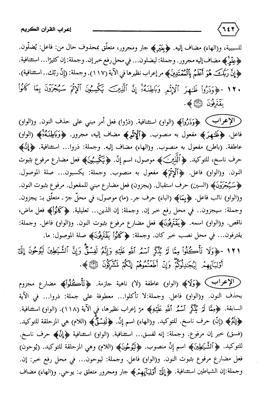 {وَذَرُوا} (الواو) استئنافية. (ذروا) فعل أمر مبني على حذف النون. و (الواو) فاعل. {ظاهِرَ} مفعول به منصوب. {الْإِثْمِ} مضاف إليه، مجرور. {وَباطِنَهُ} (الواو) عاطفة. (باطن) مفعول به منصوب. و (الهاء) مضاف إليه. وجملة: ذروا ... استئنافية. {إِنَّ} حرف ناسخ، للتوكيد. {الَّذِينَ} موصول، اسم إنّ. {يَكْسِبُونَ} فعل مضارع مرفوع بثبوت النون. و (الواو) فاعل. {الْإِثْمِ} مفعول به منصوب. وجملة: يكسبون ... صلة الموصول.
