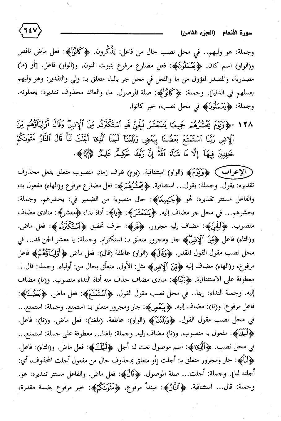 و (التاء) فاعل {مِنَ الْإِنْسِ} جار ومجرور متعلق ب: استكثرتم. وجملة: يا معشر الجن قد ... في محل نصب مقول القول المقدر. {وَقالَ} (الواو) عاطفة (قال): فعل ماض {أَوْلِياؤُهُمْ} فاعل مرفوع، و (الهاء) مضاف إليه {مِنَ الْإِنْسِ} مثل: الأول. متعلّق بحال من: أولياء. وجملة: قال