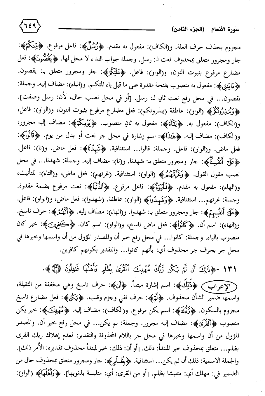 ١٣١ - {ذلِكَ أَنْ لَمْ يَكُنْ رَبُّكَ مُهْلِكَ الْقُرى بِظُلْمٍ وَأَهْلُها غافِلُونَ (١٣١)}