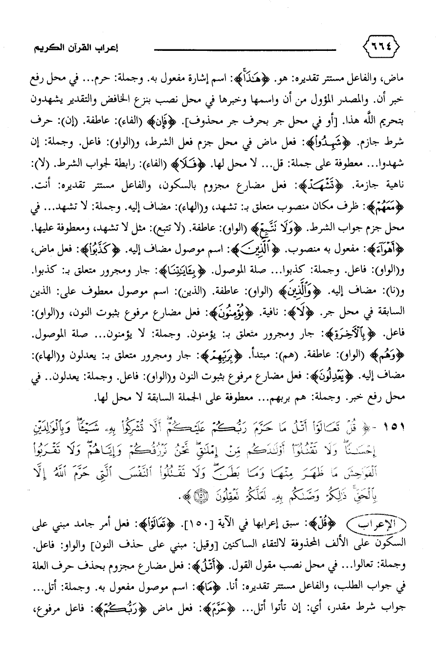{قُلْ}: سبق إعرابها في الآية [١٥٠]. {تَعالَوْا}: فعل أمر جامد مبني على السكون على الألف المحذوفة لالتقاء الساكنين [وقيل: مبني على حذف النون] والواو: فاعل.