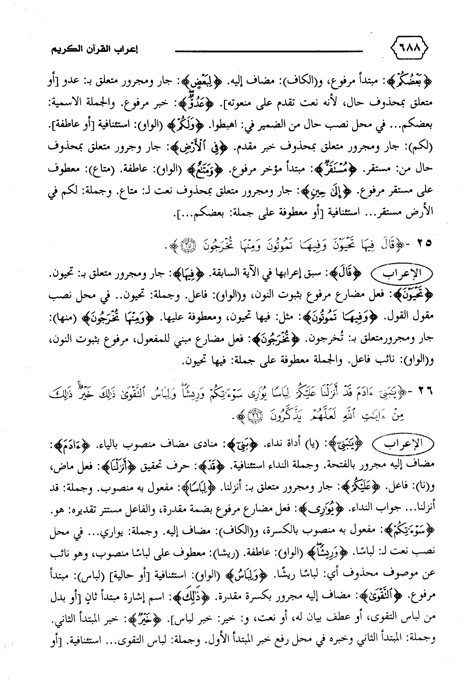 {سَوْآتِكُمْ}: مفعول به منصوب بالكسرة، و (الكاف): مضاف إليه. وجملة: يواري ... في محل نصب نعت ل: لباسا. {وَرِيشاً} (الواو): عاطفة. (ريشا): معطوف على لباسا منصوب، وهو نائب عن موصوف محذوف أي: لباسا ريشا. {وَلِباسُ} (الواو): استئنافية [أو حالية] (لباس): مبتدأ مرفوع. {التَّقْوى}: مضاف إليه مجرور بكسرة مقدرة. {ذلِكَ}: اسم إشارة مبتدأ ثان [أو بدل من لباس التقوى، أو عطف بيان له، أو نعت، و: خير: خبر لباس]. {خَيْرٌ}: خبر المبتدأ الثاني.