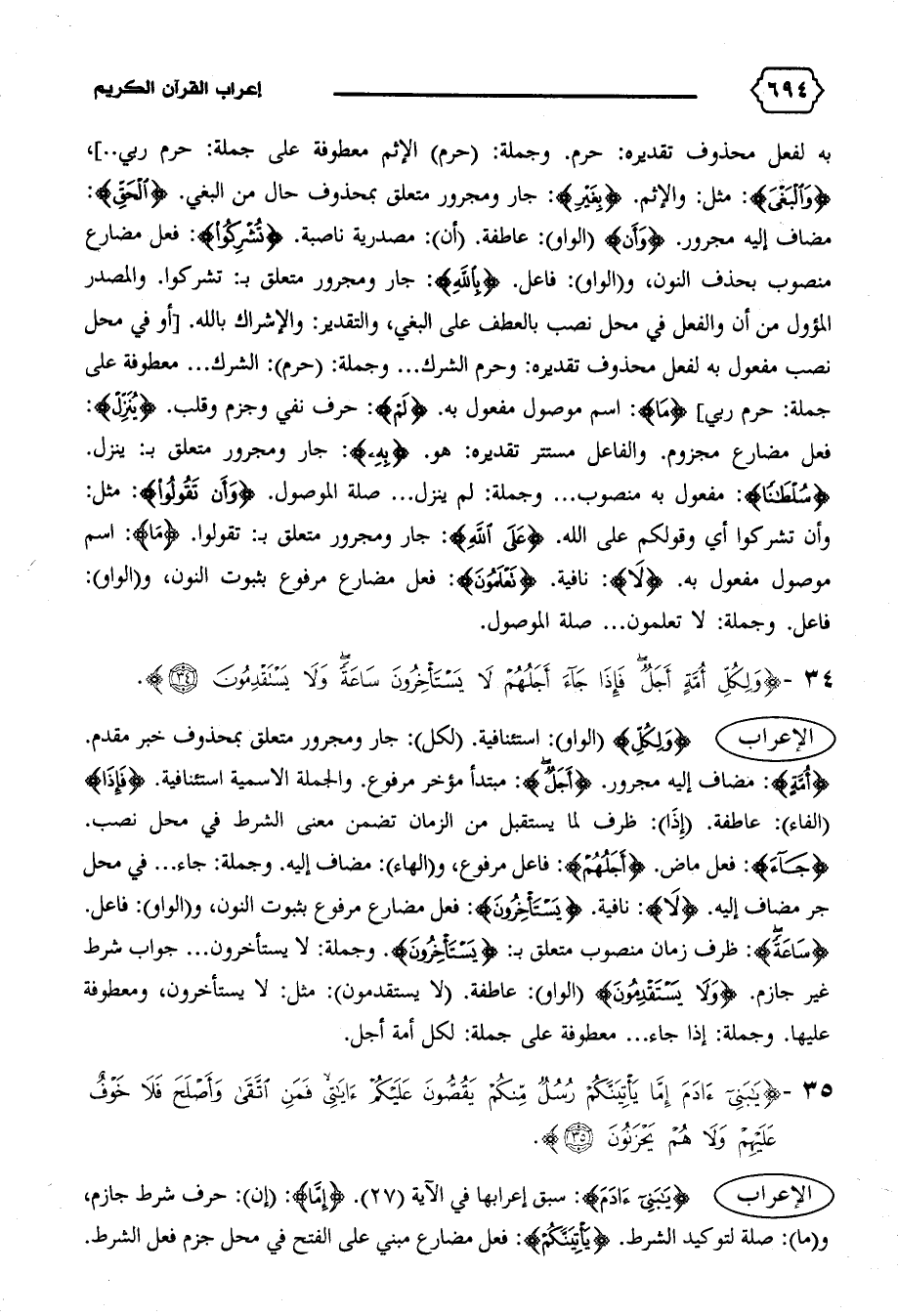 الإعراب {يا بَنِي آدَمَ}: سبق إعرابها في الآية (٢٧). {إِمّا}: (إن): حرف شرط جازم، و (ما): صلة لتوكيد الشرط. {يَأْتِيَنَّكُمْ}: فعل مضارع مبني على الفتح في محل جزم فعل الشرط.