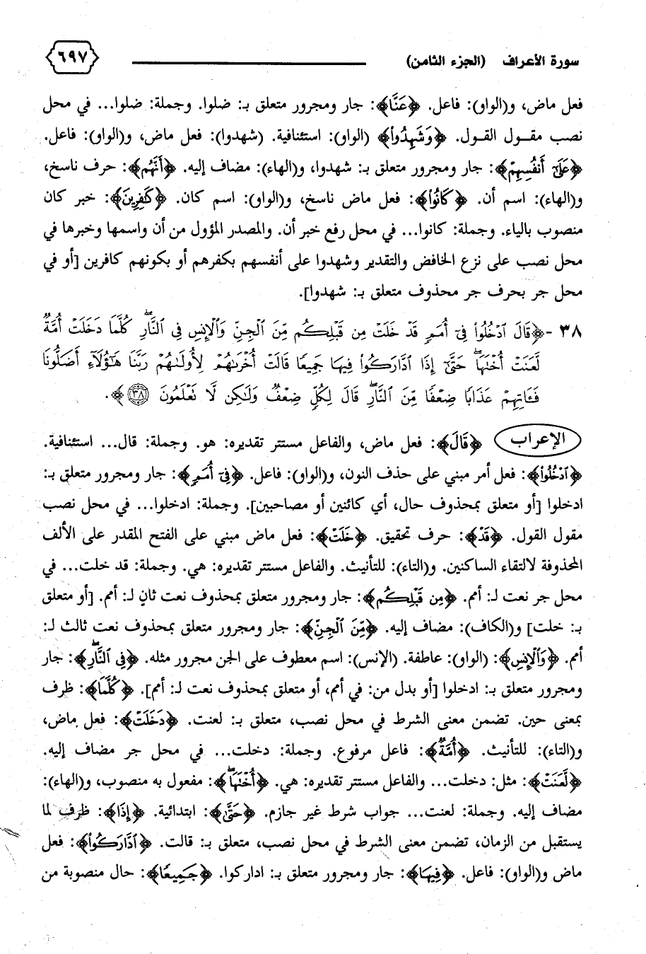 {قالَ اُدْخُلُوا فِي أُمَمٍ قَدْ خَلَتْ مِنْ قَبْلِكُمْ مِنَ الْجِنِّ وَالْإِنْسِ فِي النّارِ كُلَّما دَخَلَتْ أُمَّةٌ لَعَنَتْ أُخْتَها حَتّى إِذَا اِدّارَكُوا فِيها جَمِيعاً قالَتْ أُخْراهُمْ لِأُولاهُمْ رَبَّنا هؤُلاءِ أَضَلُّونا فَآتِهِمْ عَذاباً ضِعْفاً مِنَ النّارِ قالَ لِكُلٍّ ضِعْفٌ وَلكِنْ لا تَعْلَمُونَ (٣٨)}
