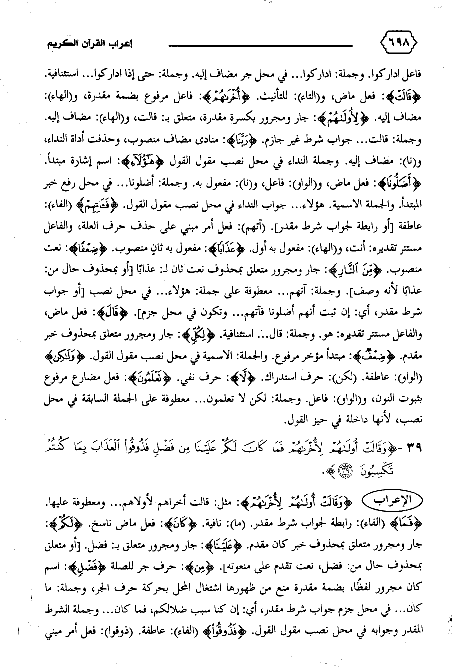 عذابا لأنه وصف].وجملة: آتهم ... معطوفة على جملة: هؤلاء ... في محل نصب [أو جواب شرط مقدر، أي: إن ثبت أنهم أضلونا فآتهم ... وتكون في محل جزم]. {قالَ}: فعل ماض، والفاعل مستتر تقديره: هو. وجملة: قال ... استئنافية. {لِكُلٍّ}: جار ومجرور متعلق بمحذوف خبر مقدم. {ضِعْفٌ}: مبتدأ مؤخر مرفوع. والجملة: الاسمية في محل نصب مقول القول. {وَلكِنْ} (الواو): عاطفة. (لكن): حرف استدراك. {لا}: حرف نفي. {تَعْلَمُونَ}: فعل مضارع مرفوع بثبوت النون، و (الواو): فاعل. وجملة: لكن لا تعلمون ... معطوفة على الجملة السابقة في محل نصب، لأنها داخلة في حيز القول.
