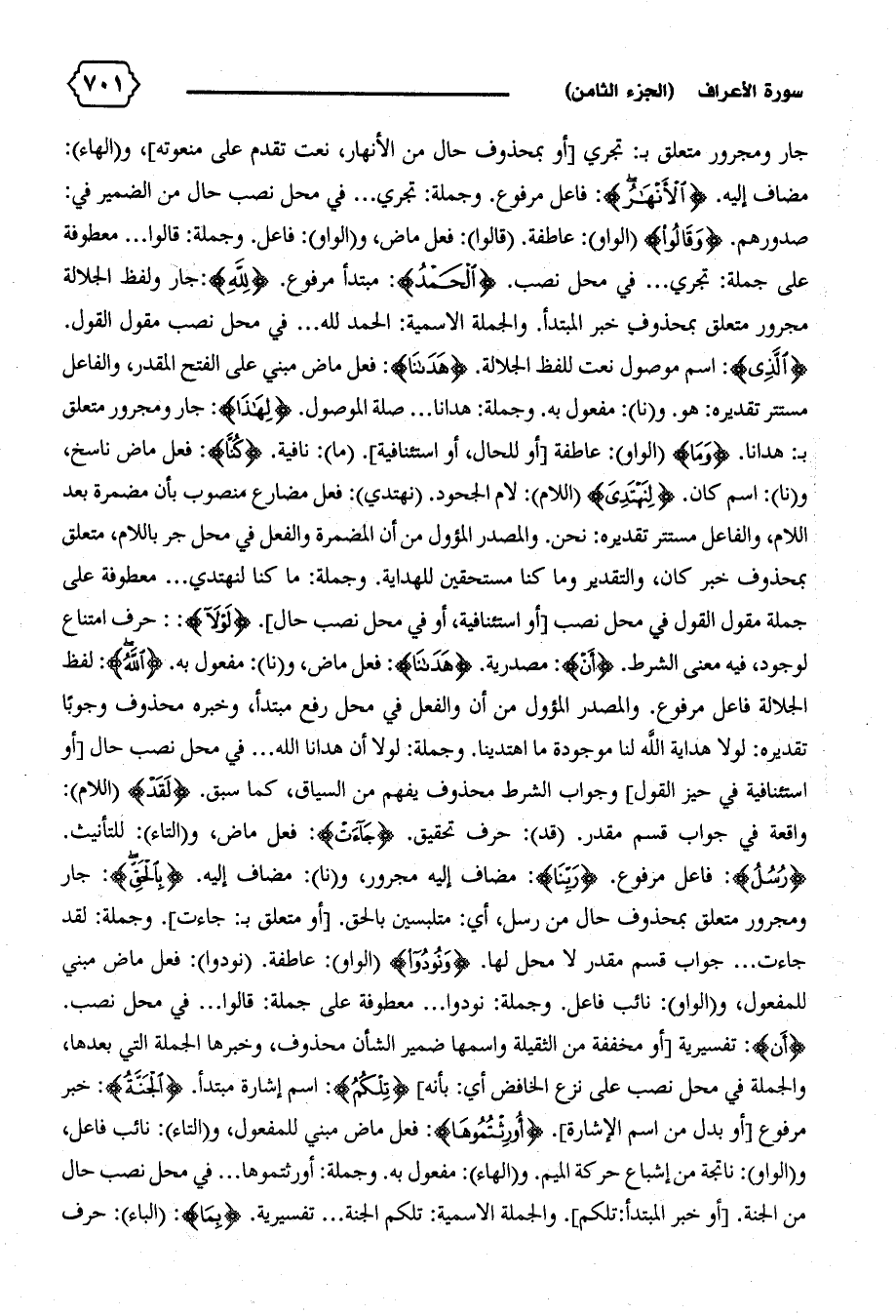 {الَّذِي}: اسم موصول نعت للفظ الجلالة. {هَدانا}: فعل ماض مبني على الفتح المقدر، والفاعل مستتر تقديره: هو. و (نا): مفعول به. وجملة: هدانا ... صلة الموصول. {لِهذا}: جار ومجرور متعلق ب: هدانا. {وَما} (الواو): عاطفة [أو للحال، أو استئنافية]. (ما): نافية. {كُنّا}: فعل ماض ناسخ، و (نا): اسم كان. {لِنَهْتَدِيَ} (اللام): لام الجحود. (نهتدي): فعل مضارع منصوب بأن مضمرة بعد اللام، والفاعل مستتر تقديره: نحن. والمصدر المؤول من أن المضمرة والفعل في محل جر باللام، متعلق بمحذوف خبر كان، والتقدير وما كنا مستحقين للهداية. وجملة: ما كنا لنهتدي ... معطوفة على جملة مقول القول في محل نصب [أو استئنافية، أو في محل نصب حال]. {لَوْلا}: حرف امتناع لوجود، فيه معنى الشرط. {أَنْ}: مصدرية. {هَدانا}: فعل ماض، و (نا): مفعول به. {اللهُ}: لفظ الجلالة فاعل مرفوع. والمصدر المؤول من أن والفعل في محل رفع مبتدأ، وخبره محذوف وجوبا تقديره: لولا هداية الله لنا موجودة ما اهتدينا. وجملة: لولا أن هدانا الله ... في محل نصب حال [أو استئنافية في حيز القول] وجواب الشرط محذوف يفهم من السياق، كما سبق. {لَقَدْ} (اللام):