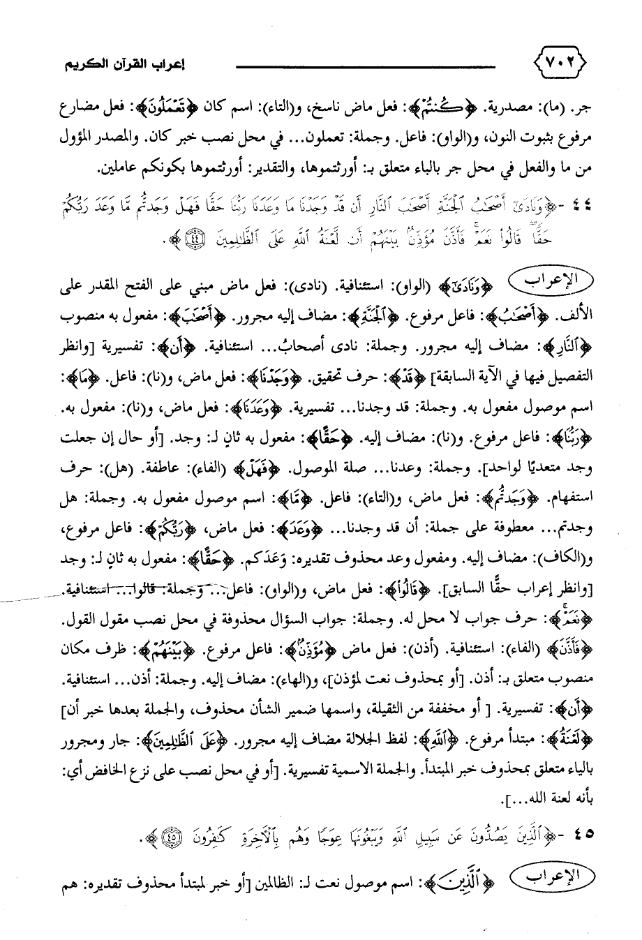 الإعراب {وَنادى} (الواو): استئنافية. (نادى): فعل ماض مبني على الفتح المقدر على الألف. {أَصْحابُ}: فاعل مرفوع. {الْجَنَّةِ}: مضاف إليه مجرور. {أَصْحابُ}: مفعول به منصوب {النّارِ}: مضاف إليه مجرور. وجملة: نادى أصحاب ... استئنافية. {أَنْ}: تفسيرية [وانظر التفصيل فيها في الآية السابقة] {قَدْ}: حرف تحقيق. {وَجَدْنا}: فعل ماض، و (نا): فاعل. {ما}: