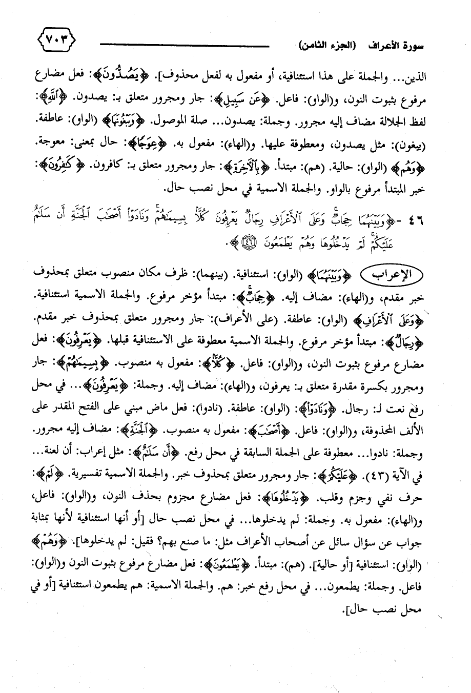 {وَبَيْنَهُما حِجابٌ وَعَلَى الْأَعْرافِ رِجالٌ يَعْرِفُونَ كُلاًّ بِسِيماهُمْ وَنادَوْا أَصْحابَ الْجَنَّةِ أَنْ سَلامٌ عَلَيْكُمْ لَمْ يَدْخُلُوها وَهُمْ يَطْمَعُونَ (٤٦)}