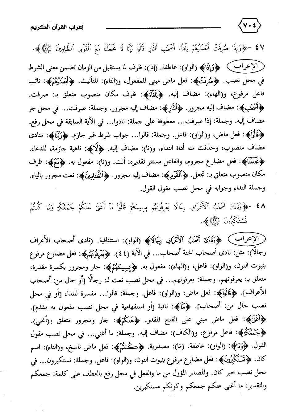 الإعراب {وَنادى أَصْحابُ الْأَعْرافِ رِجالاً} (الواو): استئنافية. (نادى أصحاب الأعراف رجالا): مثل: نادى أصحاب الجنة أصحاب ... في الآية (٤٤). {يَعْرِفُونَهُمْ}: فعل مضارع مرفوع بثبوت النون، و (الواو): فاعل، و (الهاء): مفعول به. {بِسِيماهُمْ}: جار ومجرور بكسرة مقدرة، متعلق ب: يعرفونهم. وجملة: يعرفونهم ... في محل نصب نعت ل: رجالا [أو حال من: أصحاب الأعراف]. {قالُوا}: فعل ماض، و (الواو): فاعل. وجملة: قالوا ... مفسرة للنداء [أو في محل نصب حال من: أصحاب]. {ما}: نافية [أو استفهامية في محل نصب مفعول به مقدم].