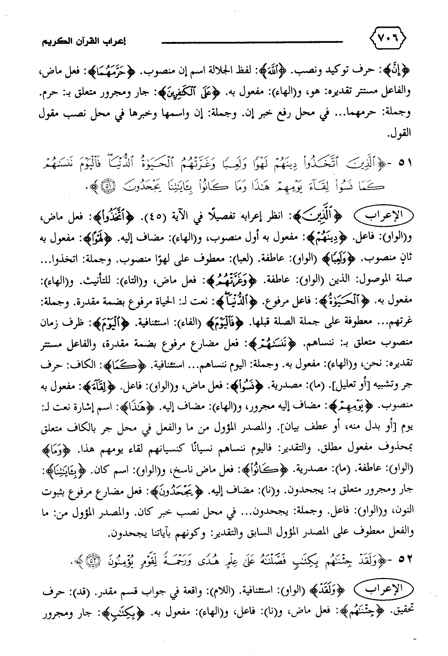 الإعراب {الَّذِينَ}: انظر إعرابه تفصيلا في الآية (٤٥). {اِتَّخَذُوا}: فعل ماض، و (الواو): فاعل. {دِينَهُمْ}: مفعول به أول منصوب، و (الهاء): مضاف إليه. {لَهْواً}: مفعول به ثان منصوب. {وَلَعِباً} (الواو): عاطفة. (لعبا): معطوف على لهوا منصوب. وجملة: اتخذوا