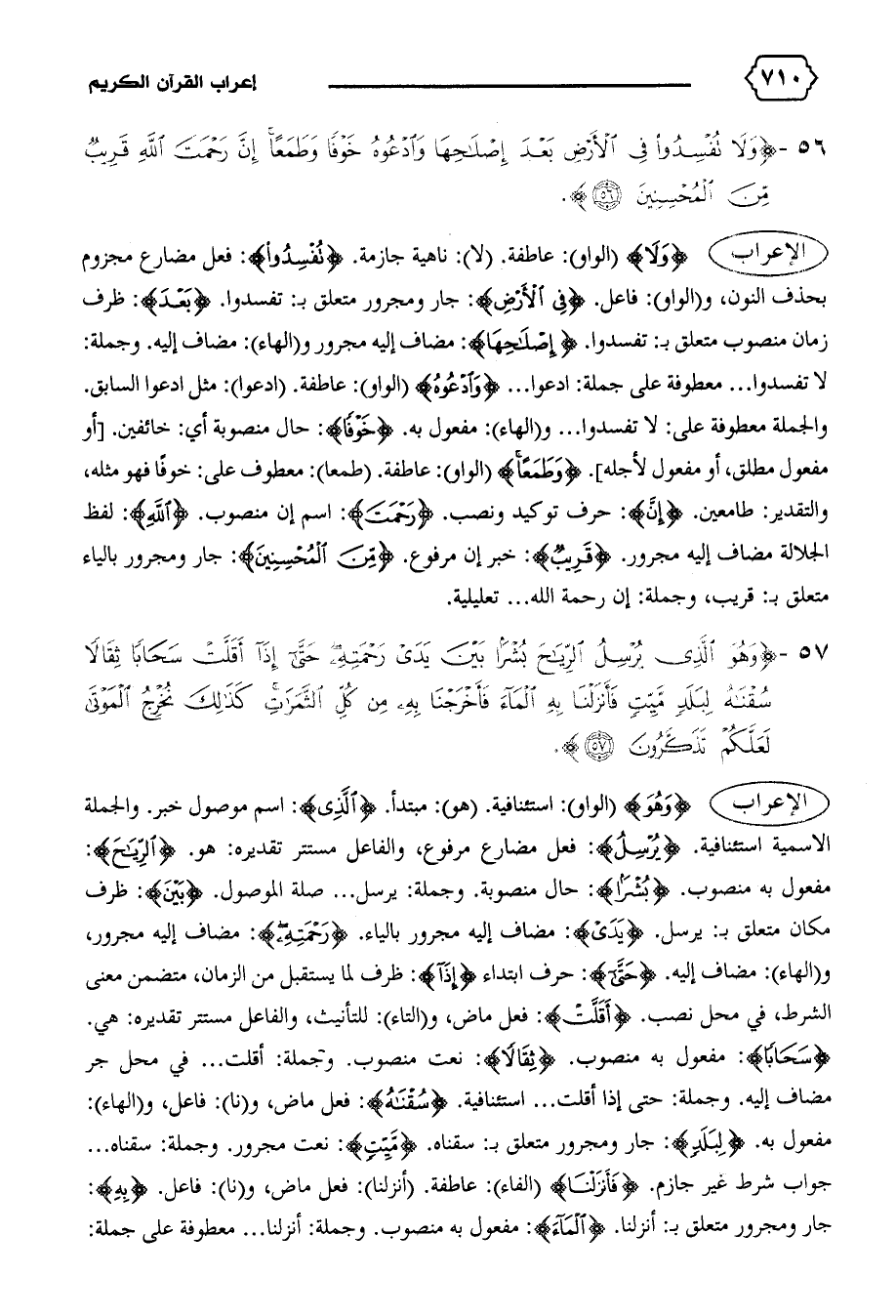 والجملة معطوفة على: لا تفسدوا ... و (الهاء): مفعول به. {خَوْفاً}: حال منصوبة أي: خائفين. [أو مفعول مطلق، أو مفعول لأجله]. {وَطَمَعاً} (الواو): عاطفة. (طمعا): معطوف على: خوفا فهو مثله، والتقدير: طامعين. {إِنَّ}: حرف توكيد ونصب. {رَحْمَتَ}: اسم إن منصوب. {اللهِ}: لفظ الجلالة مضاف إليه مجرور. {قَرِيبٌ}: خبر إن مرفوع. {مِنَ الْمُحْسِنِينَ}: جار ومجرور بالياء متعلق ب: قريب، وجملة: إن رحمة الله ... تعليلية.