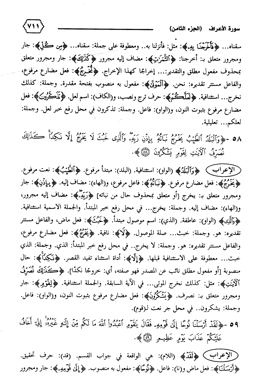 {وَالَّذِي} (الواو): عاطفة. (الذي): اسم موصول مبتدأ. {خَبُثَ}: فعل ماض، والفاعل مستتر تقديره: هو. وجملة: خبث ... صلة الموصول. {لا}: نافية. {يَخْرُجُ}: فعل مضارع مرفوع، والفاعل مستتر تقديره: هو. وجملة: لا يخرج ... في محل رفع خبر المبتدأ: الذي. وجملة: الذي خبث ... معطوفة على الاستئنافية قبلها. {إِلاّ}: أداة استثناء تفيد القصر. {نَكِداً}: حال منصوبة [أو مفعول مطلق نائب عن المصدر فهو صفته، أي: خروجا نكدا]. {كَذلِكَ نُصَرِّفُ الْآياتِ}: مثل: كذلك نخرج الموتى ... في الآية السابقة. والجملة استئنافية. {لِقَوْمٍ}: جار ومجرور متعلق ب: نصرف. {يَشْكُرُونَ}: فعل مضارع مرفوع بثبوت النون، و (الواو): فاعل.