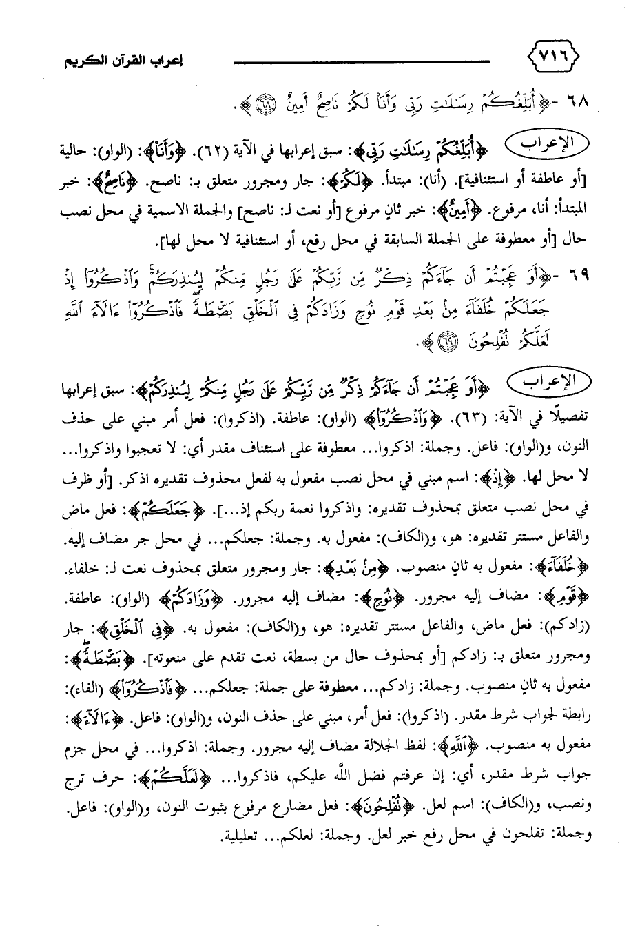 الإعراب {أُبَلِّغُكُمْ رِسالاتِ رَبِّي}: سبق إعرابها في الآية (٦٢). {وَأَنَا}: (الواو): حالية [أو عاطفة أو استئنافية]. (أنا): مبتدأ. {لَكُمْ}: جار ومجرور متعلق ب: ناصح. {ناصِحٌ}: خبر المبتدأ: أنا، مرفوع. {أَمِينٌ}: خبر ثان مرفوع [أو نعت ل: ناصح] والجملة الاسمية في محل نصب حال [أو معطوفة على الجملة السابقة في محل رفع، أو استئنافية لا محل لها].