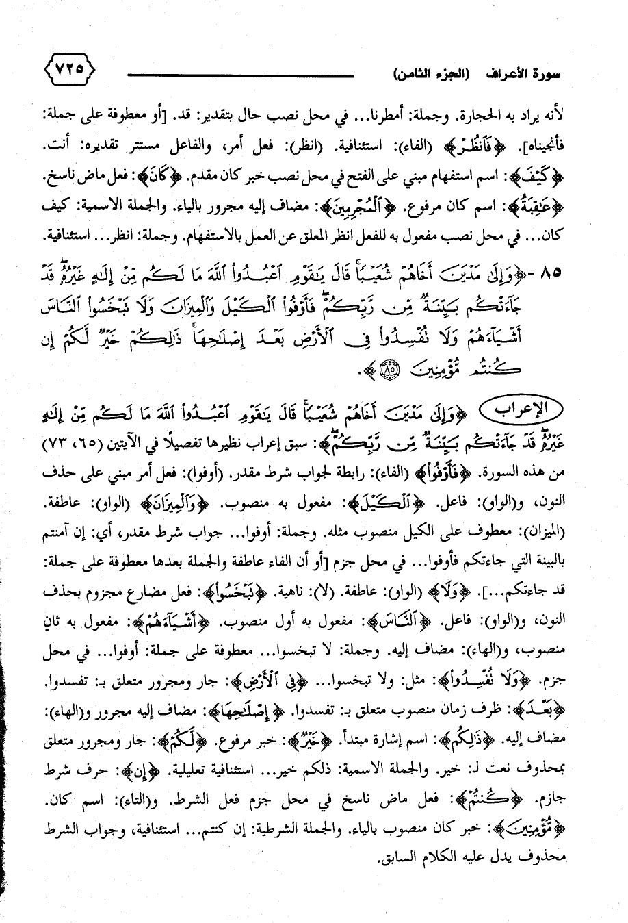 الإعراب {وَإِلى مَدْيَنَ أَخاهُمْ شُعَيْباً قالَ يا قَوْمِ اعْبُدُوا اللهَ ما لَكُمْ مِنْ إِلهٍ غَيْرُهُ قَدْ جاءَتْكُمْ بَيِّنَةٌ مِنْ رَبِّكُمْ}: سبق إعراب نظيرها تفصيلا في الآيتين (٦٥، ٧٣) من هذه السورة. {فَأَوْفُوا} (الفاء): رابطة لجواب شرط مقدر. (أوفوا): فعل أمر مبني على حذف النون، و (الواو): فاعل. {الْكَيْلَ}: مفعول به منصوب. {وَالْمِيزانَ} (الواو): عاطفة.