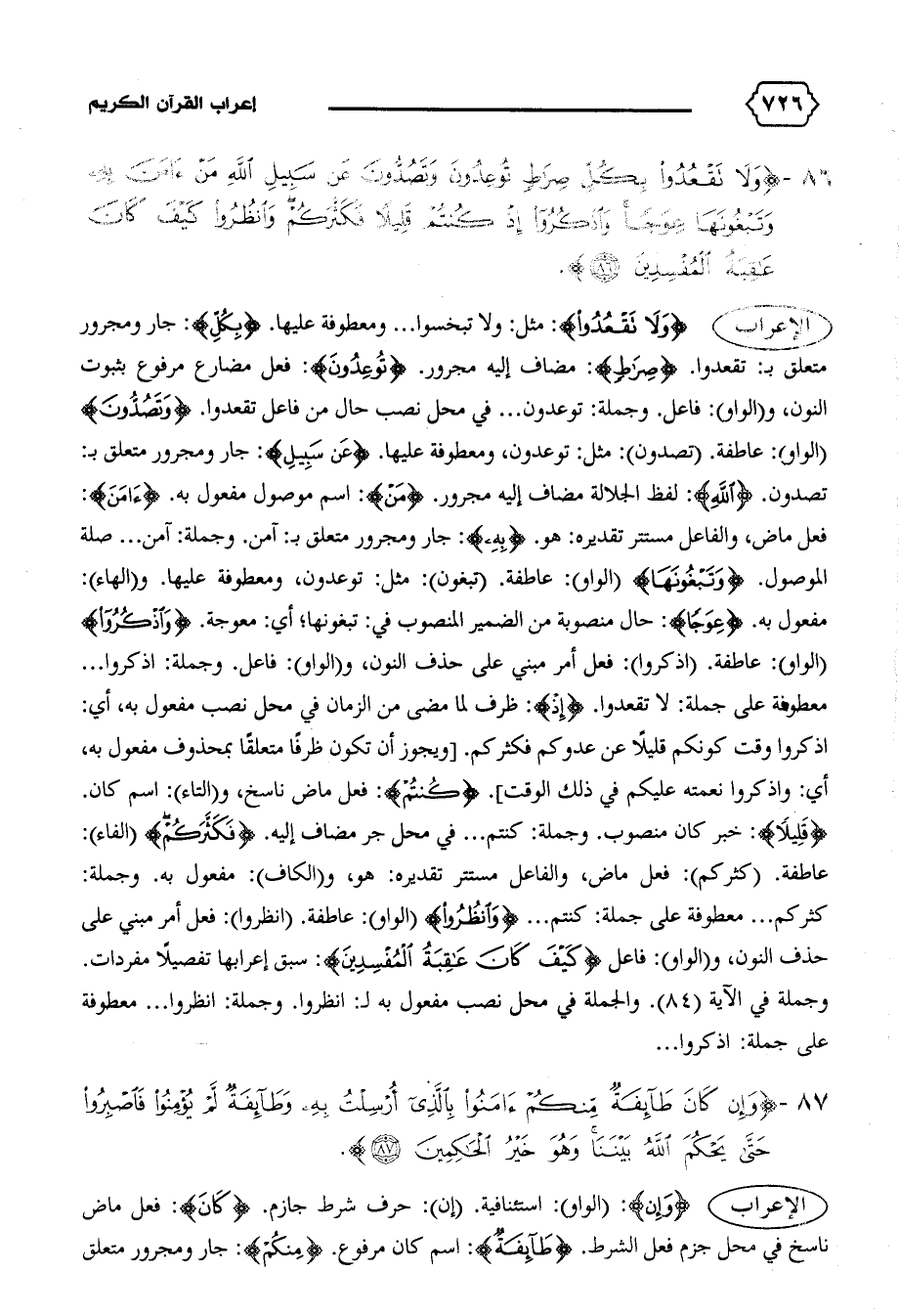 الإعراب {وَلا تَقْعُدُوا}: مثل: ولا تبخسوا ... ومعطوفة عليها. {بِكُلِّ}: جار ومجرور متعلق ب: تقعدوا. {صِراطٍ}: مضاف إليه مجرور. {تُوعِدُونَ}: فعل مضارع مرفوع بثبوت النون، و (الواو): فاعل. وجملة: توعدون ... في محل نصب حال من فاعل تقعدوا. {وَتَصُدُّونَ} (الواو): عاطفة. (تصدون): مثل: توعدون، ومعطوفة عليها. {عَنْ سَبِيلِ}: جار ومجرور متعلق ب: