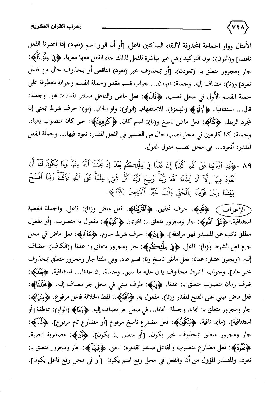 الإعراب {قَدِ}: حرف تحقيق. {اِفْتَرَيْنا}: فعل ماض و (نا): فاعل. والجملة الفعلية استئنافية. {عَلَى اللهِ}: جار ومجرور متعلق ب: افترى. {كَذِباً}: مفعول به منصوب. [أو مفعول مطلق نائب عن المصدر فهو مرادفه]. {إِنْ}: حرف شرط جازم. {عُدْنا}: فعل ماض في محل جزم فعل الشرط و (نا): فاعل. {فِي مِلَّتِكُمْ}: جار ومجرور متعلق ب: عدنا و (الكاف): مضاف إليه. [ويجوز اعتبار: عدنا: فعل ماض ناسخ ونا: اسم عاد. وفي ملتنا جار ومجرور متعلق بمحذوف خبر عاد].وجواب الشرط محذوف يدل عليه ما سبق. وجملة: إن عدنا ... استئنافية. {بَعْدَ}: