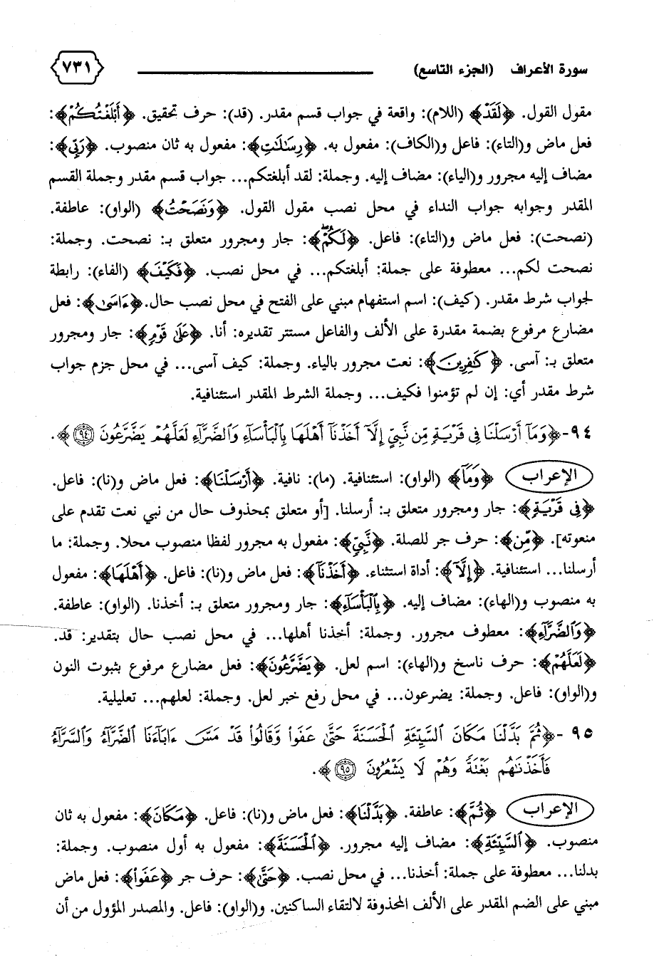 {فِي قَرْيَةٍ}: جار ومجرور متعلق ب: أرسلنا. [أو متعلق بمحذوف حال من نبي نعت تقدم على منعوته]. {مِنْ}: حرف جر للصلة. {نَبِيٍّ}: مفعول به مجرور لفظا منصوب محلا. وجملة: ما أرسلنا ... استئنافية. {إِلاّ}: أداة استثناء. {أَخَذْنا}: فعل ماض و (نا): فاعل. {أَهْلَها}: مفعول به منصوب و (الهاء): مضاف إليه. {بِالْبَأْساءِ}: جار ومجرور متعلق ب: أخذنا. (الواو): عاطفة.
