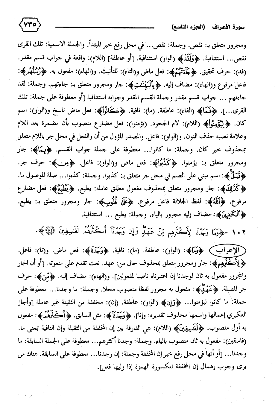ومجرور متعلق ب: نقص. وجملة: نقص ... في محل رفع خبر المبتدأ. والجملة الاسمية: تلك القرى نقص ... استئنافية. {وَلَقَدْ} (الواو) استئنافية. [أو عاطفة] (اللام): واقعة في جواب قسم مقدر.