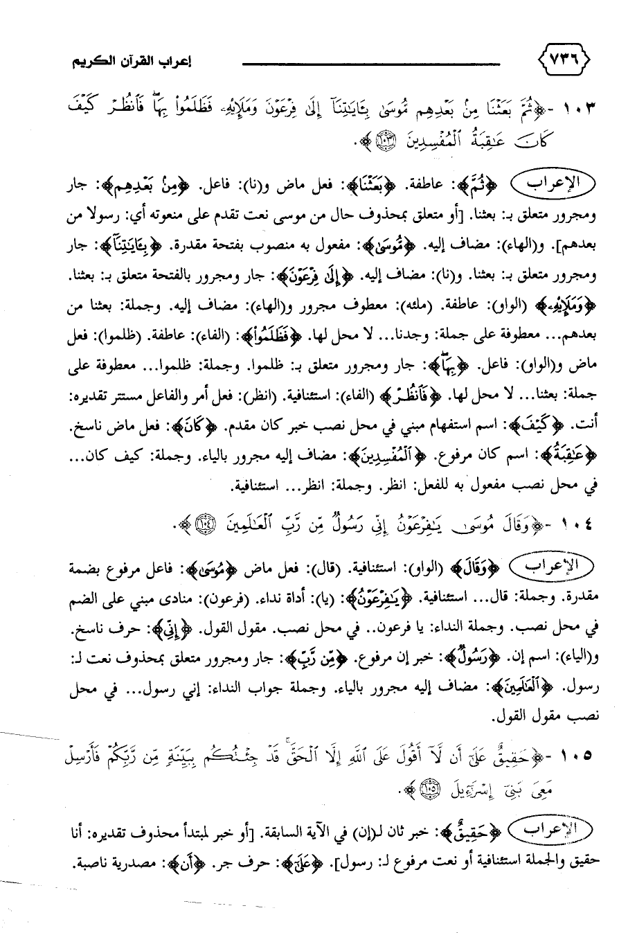 الإعراب {ثُمَّ}: عاطفة. {بَعَثْنا}: فعل ماض و (نا): فاعل. {مِنْ بَعْدِهِمْ}: جار ومجرور متعلق ب: بعثنا. [أو متعلق بمحذوف حال من موسى نعت تقدم على منعوته أي: رسولا من بعدهم].و (الهاء): مضاف إليه. {مُوسى}: مفعول به منصوب بفتحة مقدرة. {بِآياتِنا}: جار ومجرور متعلق ب: بعثنا. و (نا): مضاف إليه. {إِلى فِرْعَوْنَ}: جار ومجرور بالفتحة متعلق ب: بعثنا.