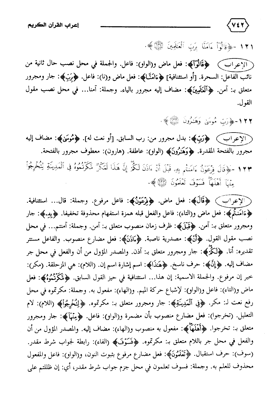 الإعراب {قالُوا}: فعل ماض و (الواو): فاعل. والجملة في محل نصب حال ثانية من نائب الفاعل: السحرة. [أو استئنافية] {آمَنّا}: فعل ماض و (نا): فاعل. {بِرَبِّ}: جار ومجرور متعلق ب: آمن. {الْعالَمِينَ}: مضاف إليه مجرور بالياء. وجملة: آمنا ... في محل نصب مقول القول.