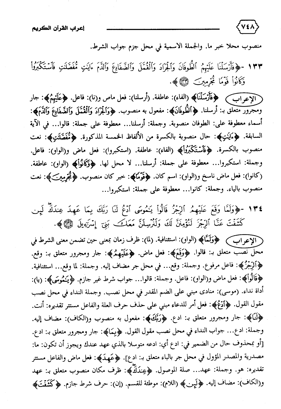 الإعراب {فَأَرْسَلْنا} (الفاء): عاطفة. (أرسلنا): فعل ماض و (نا): فاعل. {عَلَيْهِمُ}: جار ومجرور متعلق ب: أرسلنا. {الطُّوفانَ}: مفعول به منصوب. {وَالْجَرادَ وَالْقُمَّلَ وَالضَّفادِعَ وَالدَّمَ}: