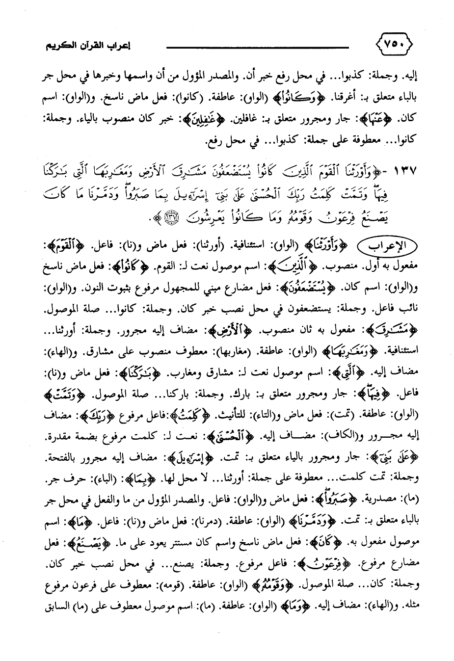 {وَأَوْرَثْنَا الْقَوْمَ الَّذِينَ كانُوا يُسْتَضْعَفُونَ مَشارِقَ الْأَرْضِ وَمَغارِبَهَا الَّتِي بارَكْنا فِيها وَتَمَّتْ كَلِمَتُ رَبِّكَ الْحُسْنى عَلى بَنِي إِسْرائِيلَ بِما صَبَرُوا وَدَمَّرْنا ما كانَ يَصْنَعُ فِرْعَوْنُ وَقَوْمُهُ وَما كانُوا يَعْرِشُونَ (١٣٧)}
