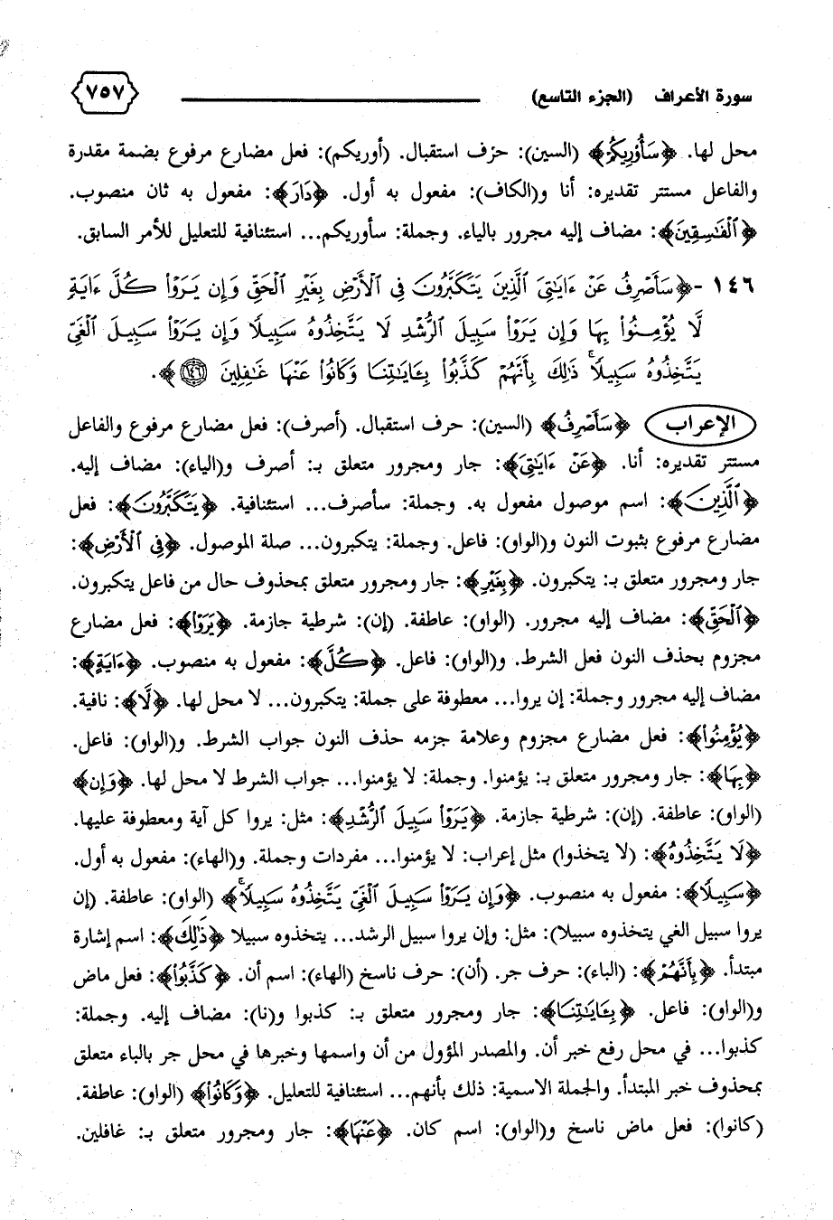 الإعراب {سَأَصْرِفُ} (السين): حرف استقبال. (أصرف): فعل مضارع مرفوع والفاعل مستتر تقديره: أنا. {عَنْ آياتِيَ}: جار ومجرور متعلق ب: أصرف و (الياء): مضاف إليه.
