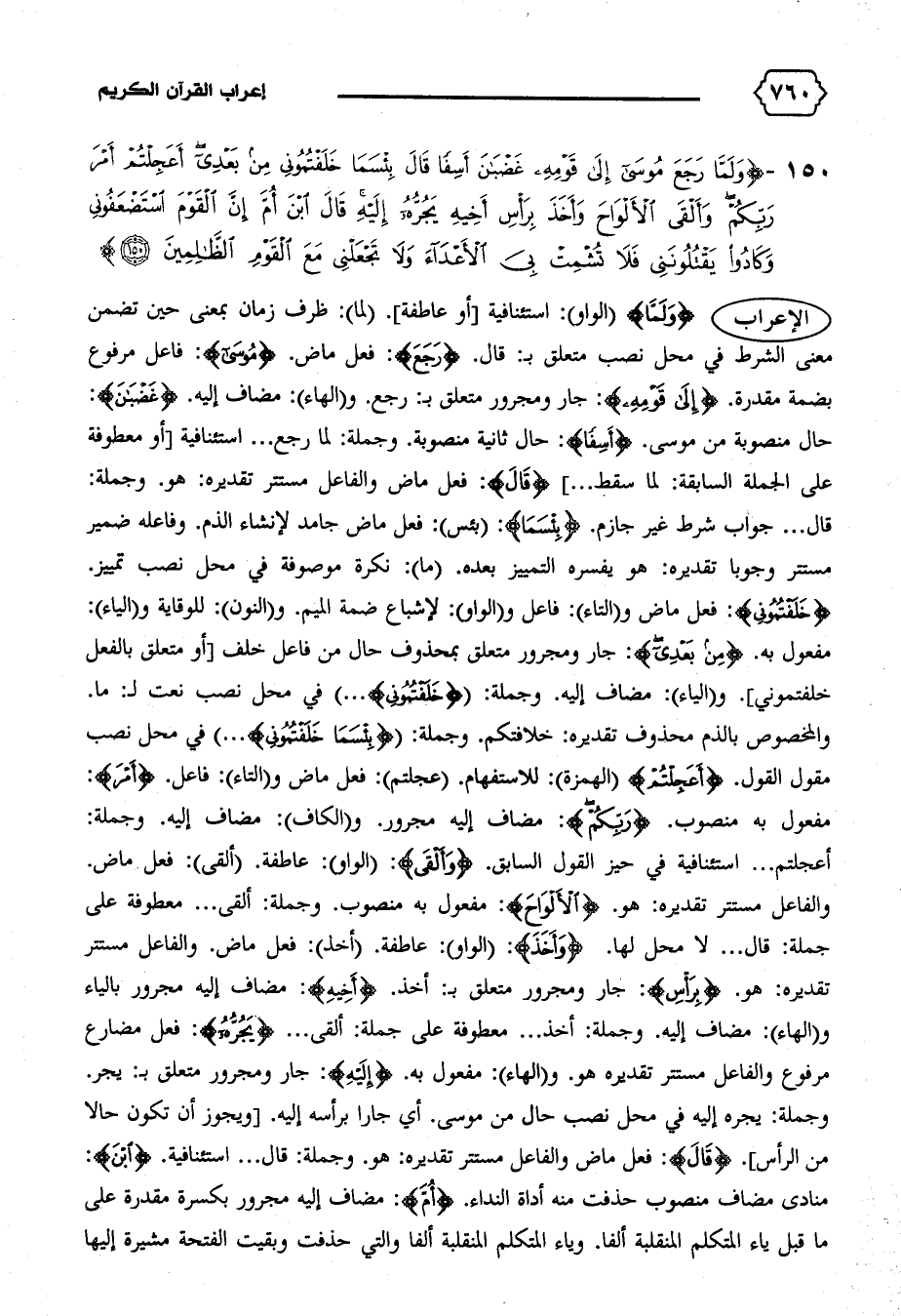 {وَلَمّا رَجَعَ مُوسى إِلى قَوْمِهِ غَضْبانَ أَسِفاً قالَ بِئْسَما خَلَفْتُمُونِي مِنْ بَعْدِي أَعَجِلْتُمْ أَمْرَ رَبِّكُمْ وَأَلْقَى الْأَلْواحَ وَأَخَذَ بِرَأْسِ أَخِيهِ يَجُرُّهُ إِلَيْهِ قالَ اِبْنَ أُمَّ إِنَّ الْقَوْمَ اِسْتَضْعَفُونِي وَكادُوا يَقْتُلُونَنِي فَلا تُشْمِتْ بِيَ الْأَعْداءَ وَلا تَجْعَلْنِي مَعَ الْقَوْمِ الظّالِمِينَ (١٥٠)}