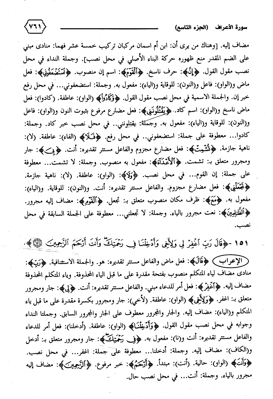 مضاف إليه. [وهناك من يرى أن: ابن أم اسمان مركبان تركيب خمسة عشر فهما: منادى مبني على الضم المقدر منع ظهوره حركة البناء الأصلي في محل نصب].وجملة النداء في محل نصب مقول القول. {إِنَّ}: حرف ناسخ. {الْقَوْمَ}: اسم إن منصوب. {اِسْتَضْعَفُونِي}: فعل ماض و (الواو): فاعل. و (النون): للوقاية و (الياء): مفعول به. وجملة: استضعفوني ... في محل رفع خبر إن. والجملة الاسمية في محل نصب مقول القول. {وَكادُوا} (الواو): عاطفة. (كادوا): فعل ماض ناسخ و (الواو): اسم كاد. {يَقْتُلُونَنِي}: فعل مضارع مرفوع بثبوت النون و (الواو): فاعل و (النون): للوقاية و (الياء): مفعول به. وجملة: يقتلونني ... في محل نصب خبر كاد. وجملة: