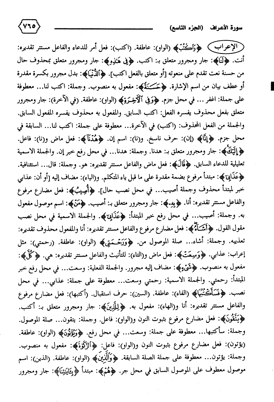 مفعول به منصوب. {شَيْءٍ}: مضاف إليه مجرور. والجملة الفعلية: وسعت ... في محل رفع خبر المبتدأ: رحمتي. والجملة الاسمية: رحمتي وسعت ... معطوفة على جملة: عذابي ... في محل نصب. {فَسَأَكْتُبُها} (الفاء): عاطفة. (السين): حرف استقبال. (أكتبها): فعل مضارع مرفوع والفاعل مستتر تقديره: أنا و (الهاء): مفعول به. {لِلَّذِينَ}: جار ومجرور متعلق ب: أكتب.