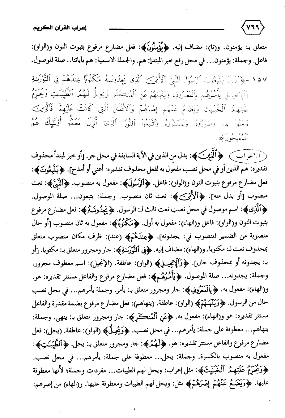 {الَّذِي}: اسم موصول في محل نصب نعت ثالث ل: الرسول. {يَجِدُونَهُ}: فعل مضارع مرفوع بثبوت النون و (الواو): فاعل و (الهاء): مفعول به أول. {مَكْتُوباً}: مفعول به ثان منصوب [أو حال منصوبة من الضمير المنصوب في: يجدونه]. {عِنْدَهُمْ} (عند): ظرف مكان منصوب متعلق بمحذوف نعت ل: مكتوبا. و (الهاء): مضاف إليه. {فِي التَّوْراةِ}: جار ومجرور متعلق ب: مكتوبا. [أو ب: يجدونه أو بمحذوف حال]. {وَالْإِنْجِيلِ} (الواو): عاطفة. (الإنجيل): اسم معطوف مجرور.
