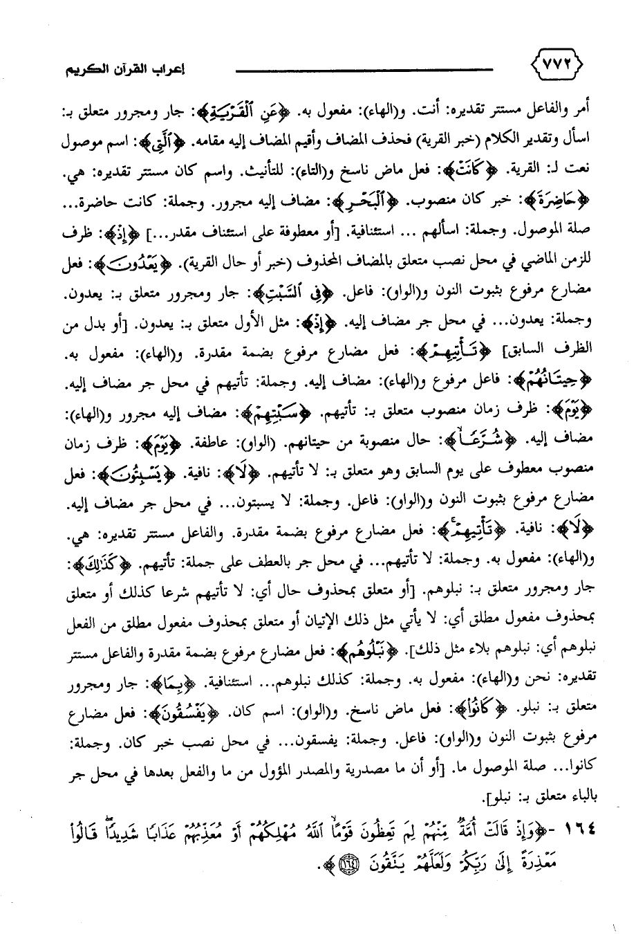 صلة الموصول. وجملة: اسألهم ... استئنافية. [أو معطوفة على استئناف مقدر ... ] {إِذْ}: ظرف للزمن الماضي في محل نصب متعلق بالمضاف المحذوف (خبر أو حال القرية). {يَعْدُونَ}: فعل مضارع مرفوع بثبوت النون و (الواو): فاعل. {فِي السَّبْتِ}: جار ومجرور متعلق ب: يعدون.