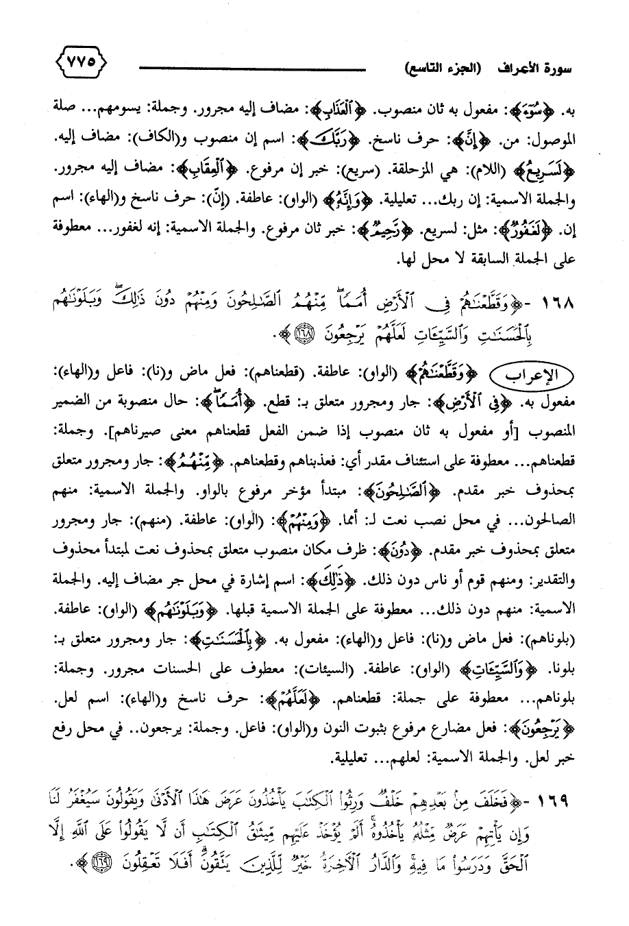 قطعناهم ... معطوفة على استئناف مقدر أي: فعذبناهم وقطعناهم. {مِنْهُمُ}: جار ومجرور متعلق بمحذوف خبر مقدم. {الصّالِحُونَ}: مبتدأ مؤخر مرفوع بالواو. والجملة الاسمية: منهم الصالحون ... في محل نصب نعت ل: أمما. {وَمِنْهُمْ}: (الواو): عاطفة. (منهم): جار ومجرور متعلق بمحذوف خبر مقدم. {دُونَ}: ظرف مكان منصوب متعلق بمحذوف نعت لمبتدإ محذوف والتقدير: ومنهم قوم أو ناس دون ذلك. {ذلِكَ}: اسم إشارة في محل جر مضاف إليه. والجملة الاسمية: منهم دون ذلك ... معطوفة على الجملة الاسمية قبلها. {وَبَلَوْناهُمْ} (الواو): عاطفة.