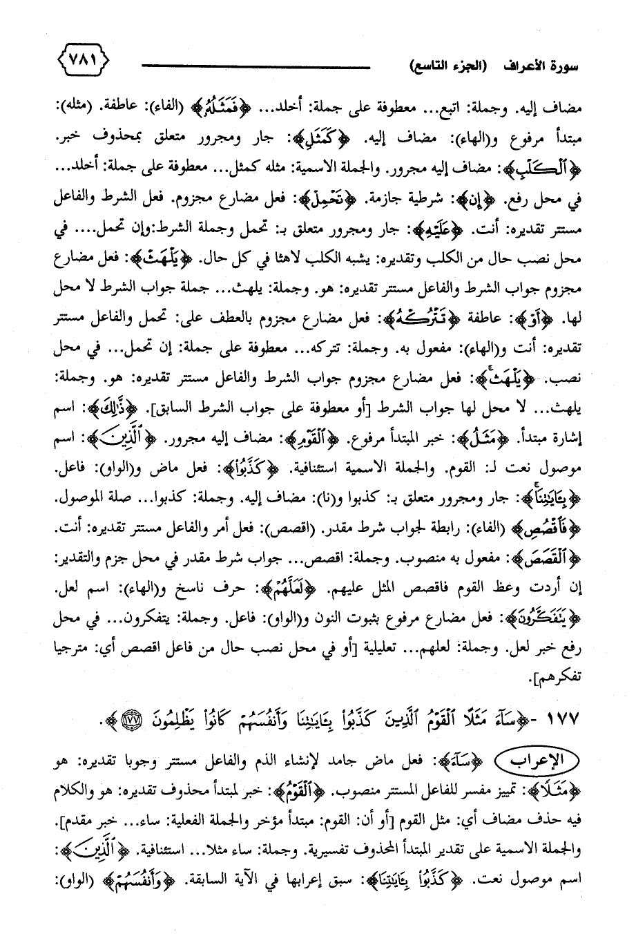 يلهث ... لا محل لها جواب الشرط [أو معطوفة على جواب الشرط السابق]. {ذلِكَ}: اسم إشارة مبتدأ. {مَثَلُ}: خبر المبتدأ مرفوع. {الْقَوْمِ}: مضاف إليه مجرور. {الَّذِينَ}: اسم موصول نعت ل: القوم. والجملة الاسمية استئنافية. {كَذَّبُوا}: فعل ماض و (الواو): فاعل.