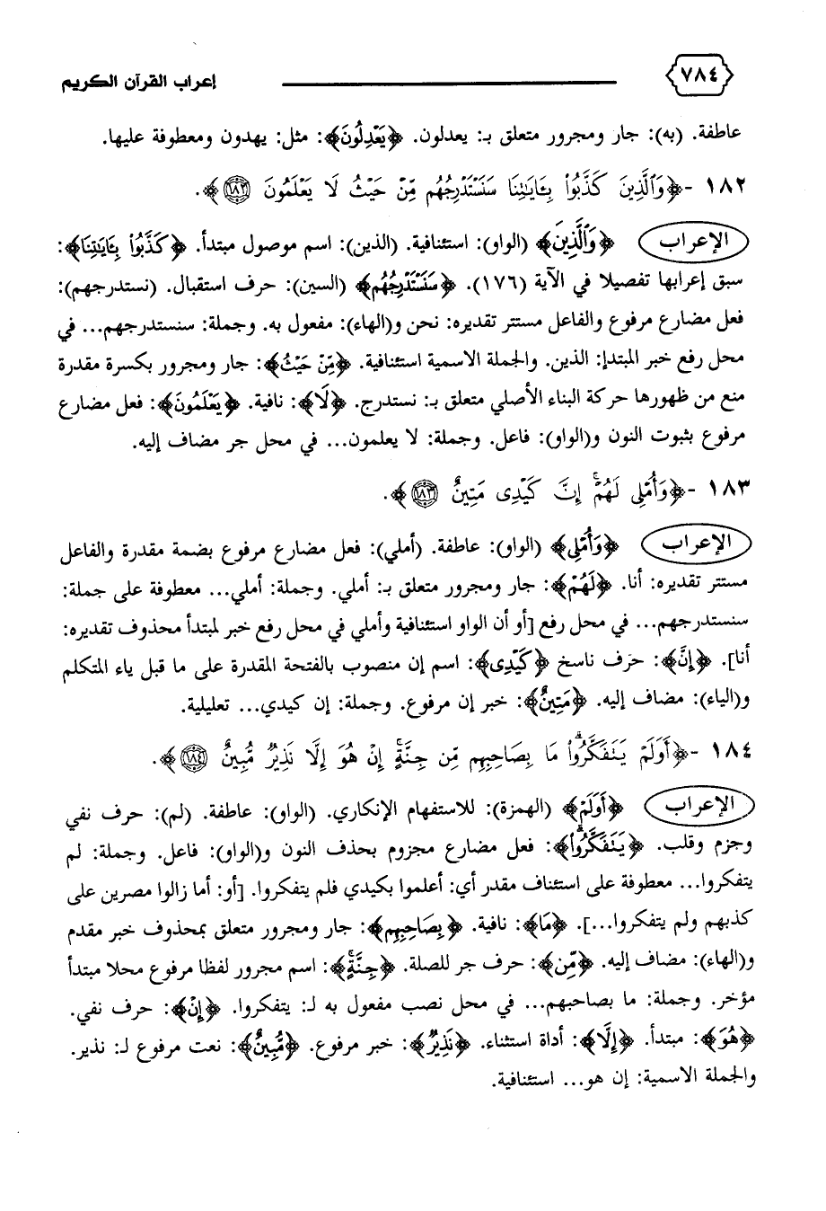 الإعراب {وَأُمْلِي} (الواو): عاطفة. (أملي): فعل مضارع مرفوع بضمة مقدرة والفاعل مستتر تقديره: أنا. {لَهُمْ}: جار ومجرور متعلق ب: أملي. وجملة: أملي ... معطوفة على جملة: