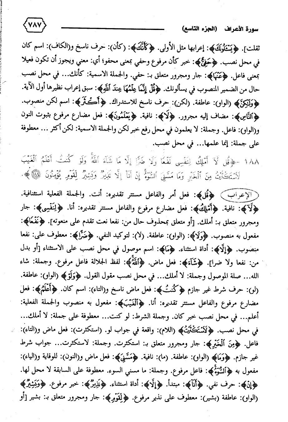 ثقلت]. {يَسْئَلُونَكَ}: إعرابها مثل الأولى. {كَأَنَّكَ}: (كأن): حرف ناسخ و (الكاف): اسم كان في محل نصب. {حَفِيٌّ}: خبر كأن مرفوع وحفي بمعنى محفو؛ أي: معني ويجوز أن تكون فعيلا بمعنى فاعل. {عَنْها}: جار ومجرور متعلق ب: حفي. والجملة الاسمية: كأنك ... في محل نصب حال من الضمير المنصوب في يسألونك. {قُلْ إِنَّما عِلْمُها عِنْدَ اللهِ}: سبق إعراب نظيرها أول الآية.