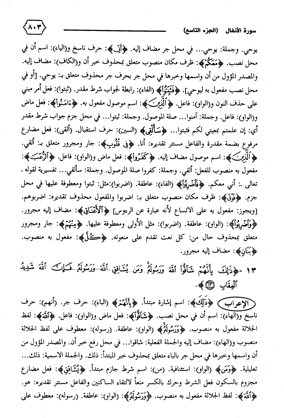 الإعراب {ذلِكَ}: اسم إشارة مبتدأ. {بِأَنَّهُمْ} (الباء): حرف جر. (أنهم): حرف ناسخ و (الهاء): اسم أن في محل نصب. {شَاقُّوا}: فعل ماض و (الواو): فاعل. {اللهَ}: لفظ الجلالة مفعول به منصوب. {وَرَسُولَهُ} (الواو): عاطفة. (رسوله): معطوف على لفظ الجلالة منصوب و (الهاء): مضاف إليه والجملة الفعلية: شاقوا ... في محل رفع خبر أن. والمصدر المؤول من أن واسمها وخبرها في محل جر بالباء متعلق بمحذوف خبر المبتدأ: ذلك. والجملة الاسمية: ذلك