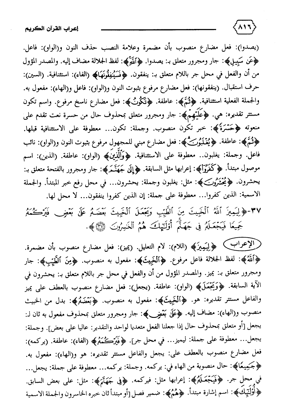 {اللهُ}: لفظ الجلالة فاعل مرفوع. {الْخَبِيثَ}: مفعول به منصوب. {مِنَ الطَّيِّبِ}: جار ومجرور متعلق ب: يميز. والمصدر المؤول من أن والفعل في محل جر باللام متعلق ب: يحشرون في الآية السابقة. {وَيَجْعَلَ} (الواو): عاطفة. (يجعل): فعل مضارع منصوب بالعطف على يميز والفاعل مستتر تقديره: هو. {الْخَبِيثَ}: مفعول به منصوب. {بَعْضَهُ}: بدل من الخبيث منصوب و (الهاء): مضاف إليه. {عَلى بَعْضٍ}: جار ومجرور متعلق بمحذوف مفعول به ثان ل: