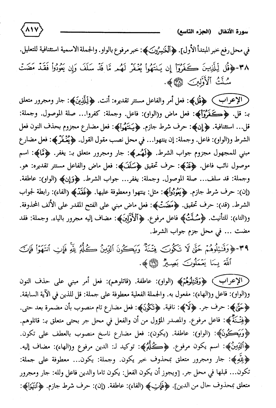 قل ... استئنافية. {إِنْ}: حرف شرط جازم. {يَنْتَهُوا}: فعل مضارع مجزوم بحذف النون فعل الشرط و (الواو): فاعل. وجملة: إن ينتهوا ... في محل نصب مقول القول. {يُغْفَرْ}: فعل مضارع مبني للمجهول مجزوم جواب الشرط. {لَهُمْ}: جار ومجرور متعلق ب: يغفر. {ما}: اسم موصول نائب فاعل. {قَدْ}: حرف تحقيق {سَلَفَ}: فعل ماض والفاعل مستتر تقديره: هو.
