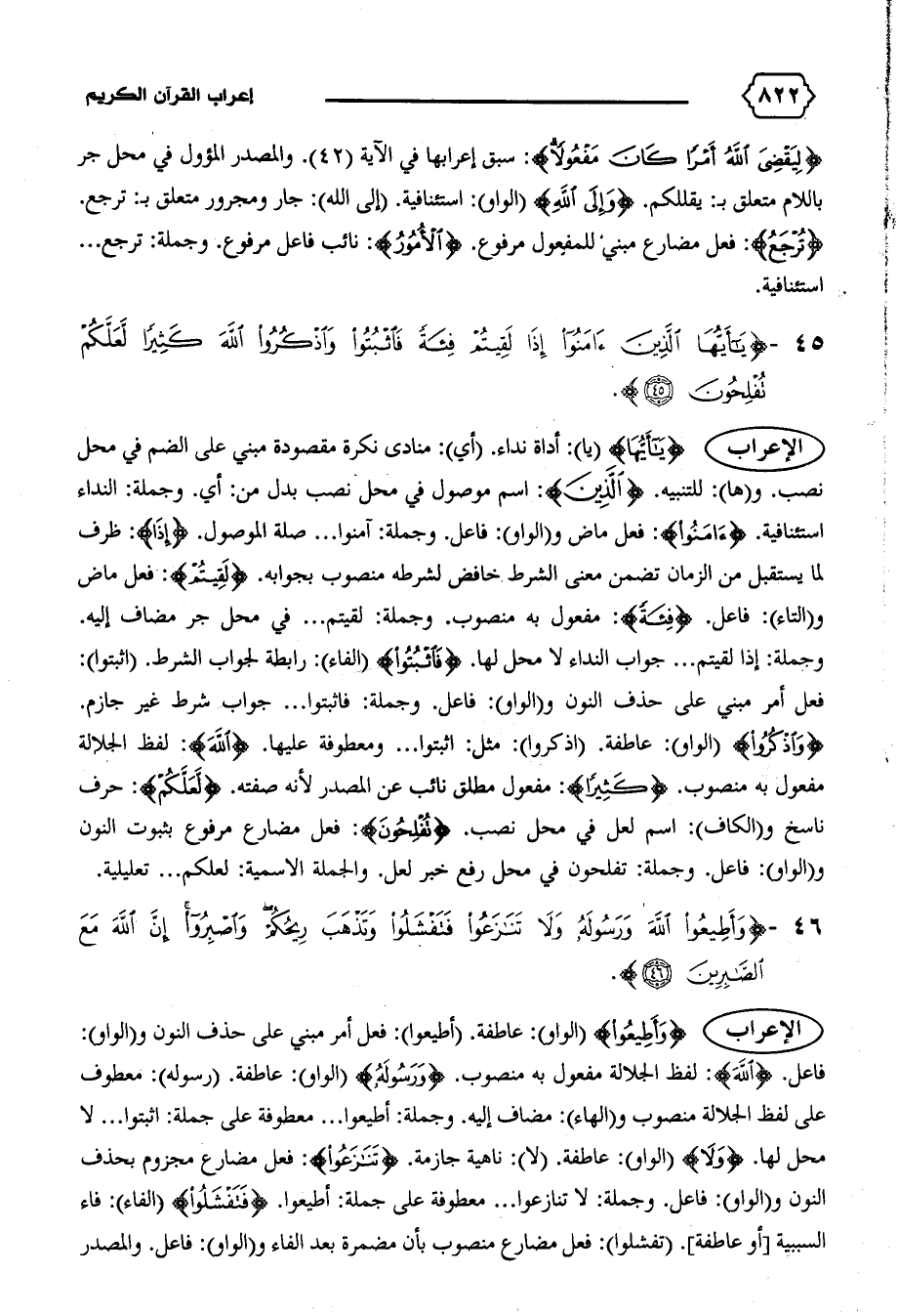 فاعل. {اللهَ}: لفظ الجلالة مفعول به منصوب. {وَرَسُولَهُ} (الواو): عاطفة. (رسوله): معطوف على لفظ الجلالة منصوب و (الهاء): مضاف إليه. وجملة: أطيعوا ... معطوفة على جملة: اثبتوا ... لا محل لها. {وَلا} (الواو): عاطفة. (لا): ناهية جازمة. {تَنازَعُوا}: فعل مضارع مجزوم بحذف النون و (الواو): فاعل. وجملة: لا تنازعوا ... معطوفة على جملة: أطيعوا. {فَتَفْشَلُوا} (الفاء): فاء السببية [أو عاطفة]. (تفشلوا): فعل مضارع منصوب بأن مضمرة بعد الفاء و (الواو): فاعل. والمصدر