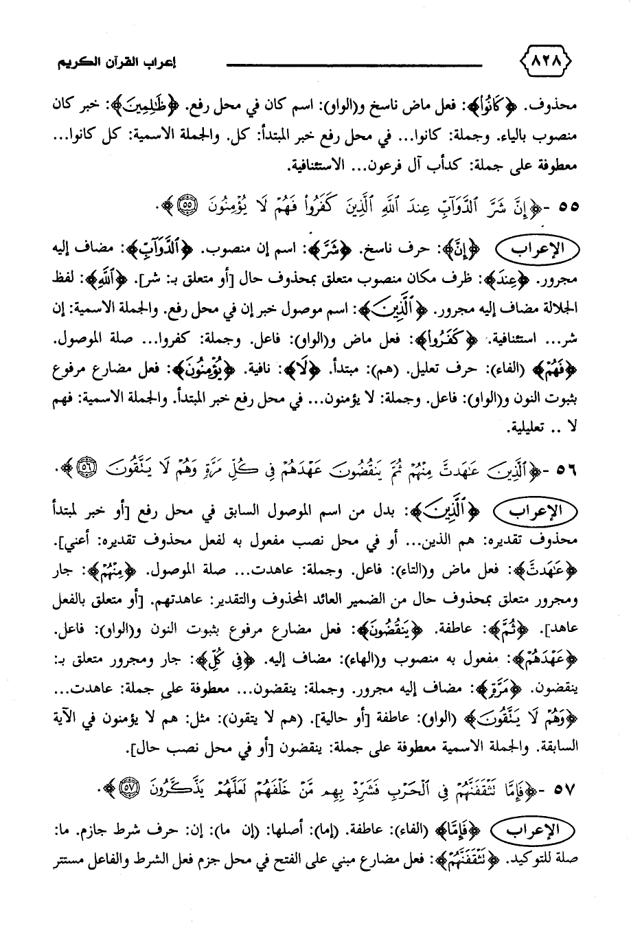 الإعراب {إِنَّ}: حرف ناسخ. {شَرَّ}: اسم إن منصوب. {الدَّوَابِّ}: مضاف إليه مجرور. {عِنْدَ}: ظرف مكان منصوب متعلق بمحذوف حال [أو متعلق ب: شر]. {اللهِ}: لفظ الجلالة مضاف إليه مجرور. {الَّذِينَ}: اسم موصول خبر إن في محل رفع. والجملة الاسمية: إن شر ... استئنافية. {كَفَرُوا}: فعل ماض و (الواو): فاعل. وجملة: كفروا ... صلة الموصول.
