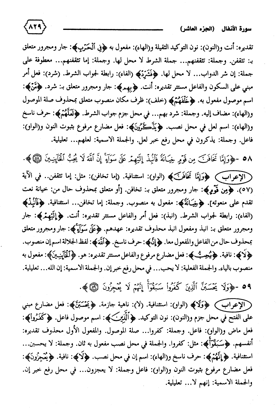 الإعراب {وَإِمّا تَخافَنَّ} (الواو): استئنافية. (إما تخافن): مثل: إما تثقفن ... في الآية (٥٧). {مِنْ قَوْمٍ}: جار ومجرور متعلق ب: تخافن. [أو متعلق بمحذوف حال من: خيانة نعت تقدم على منعوته]. {خِيانَةً}: مفعول به منصوب. وجملة: إما تخافن ... استئنافية. {فَانْبِذْ} (الفاء): رابطة لجواب الشرط. (انبذ): فعل أمر والفاعل مستتر تقديره: أنت. {إِلَيْهِمْ}: جار ومجرور متعلق ب: انبذ ومفعول انبذ محذوف تقديره: عهدهم. {عَلى سَواءٍ}: جار ومجرور متعلق بمحذوف حال من الفاعل والمفعول معا. {إِنَّ}: حرف ناسخ. {اللهَ}: لفظ الجلالة اسم إن منصوب.