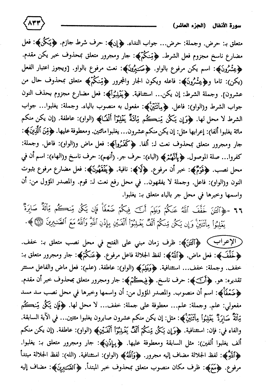 {عِشْرُونَ}: اسم يكن مرفوع بالواو. {صابِرُونَ}: نعت مرفوع بالواو. [ويجوز اعتبار الفعل (يكن): تاما و {عِشْرُونَ}: فاعله ويكون الجار والمجرور {مِنْكُمْ} متعلق بمحذوف حال من عشرون].وجملة الشرط: إن يكن ... استئنافية. {يَغْلِبُوا}: فعل مضارع مجزوم بحذف النون جواب الشرط و (الواو): فاعل. {مِائَتَيْنِ}: مفعول به منصوب بالياء. وجملة: يغلبوا ... جواب الشرط لا محل لها. {وَإِنْ يَكُنْ مِنْكُمْ مِائَةٌ يَغْلِبُوا أَلْفاً} (الواو): عاطفة. (إن يكن منكم مائة يغلبوا ألفا): إعرابها مثل: إن يكن منكم عشرون ... يغلبوا مائتين. ومعطوفة عليها. {مِنَ الَّذِينَ}: