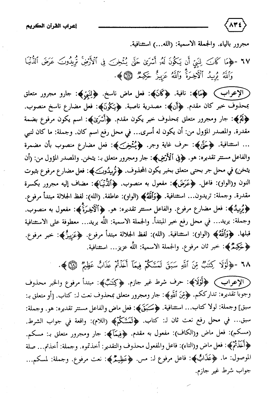 {لَهُ}: جار ومجرور متعلق بمحذوف خبر يكون مقدم. {أَسْرى}: اسم يكون مرفوع بضمة مقدرة. والمصدر المؤول من: أن يكون له أسرى ... في محل رفع اسم كان. وجملة: ما كان لنبي ... استئنافية. {حَتّى}: حرف غاية وجر. {يُثْخِنَ}: فعل مضارع منصوب بأن مضمرة والفاعل مستتر تقديره: هو. {فِي الْأَرْضِ}: جار ومجرور متعلق ب: يثخن. والمصدر المؤول من: (أن يثخن) في محل جر بحتى متعلق بخبر يكون المحذوف. {تُرِيدُونَ}: فعل مضارع مرفوع بثبوت النون و (الواو): فاعل. {عَرَضَ}: مفعول به منصوب. {الدُّنْيا}: مضاف إليه مجرور بكسرة مقدرة. وجملة: تريدون ... استئنافية. {وَاللهُ} (الواو): عاطفة. (الله): لفظ الجلالة مبتدأ مرفوع.